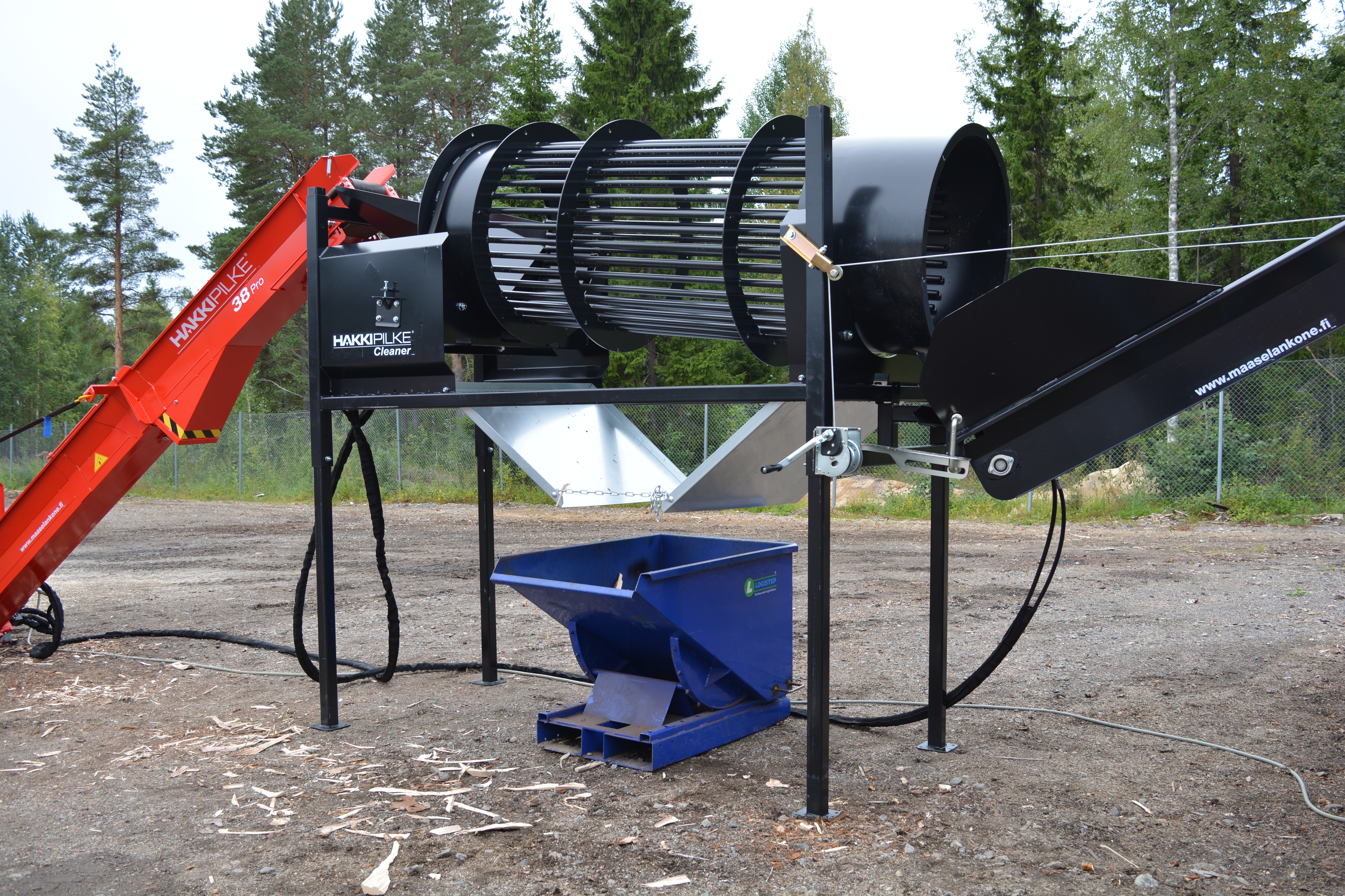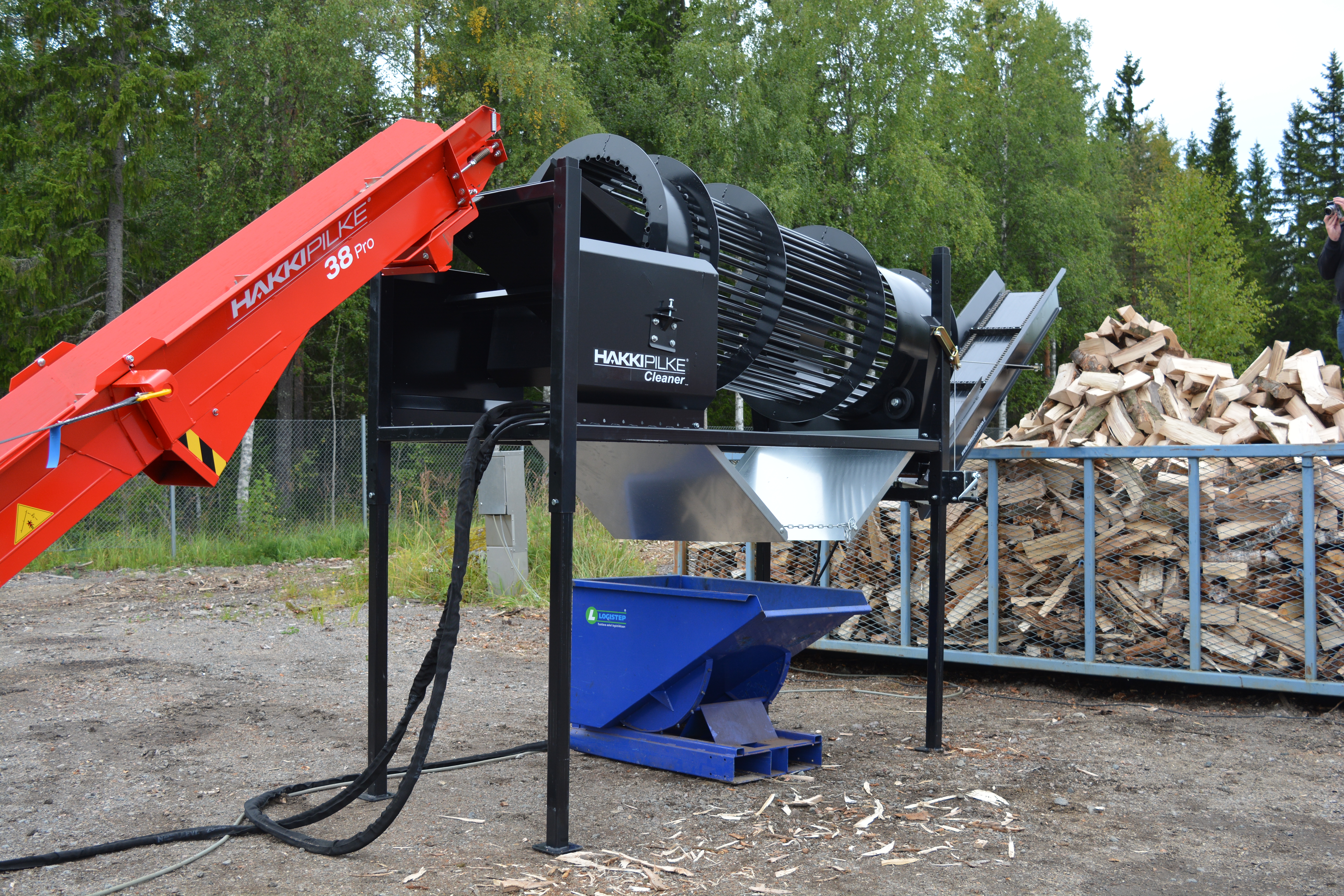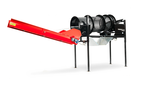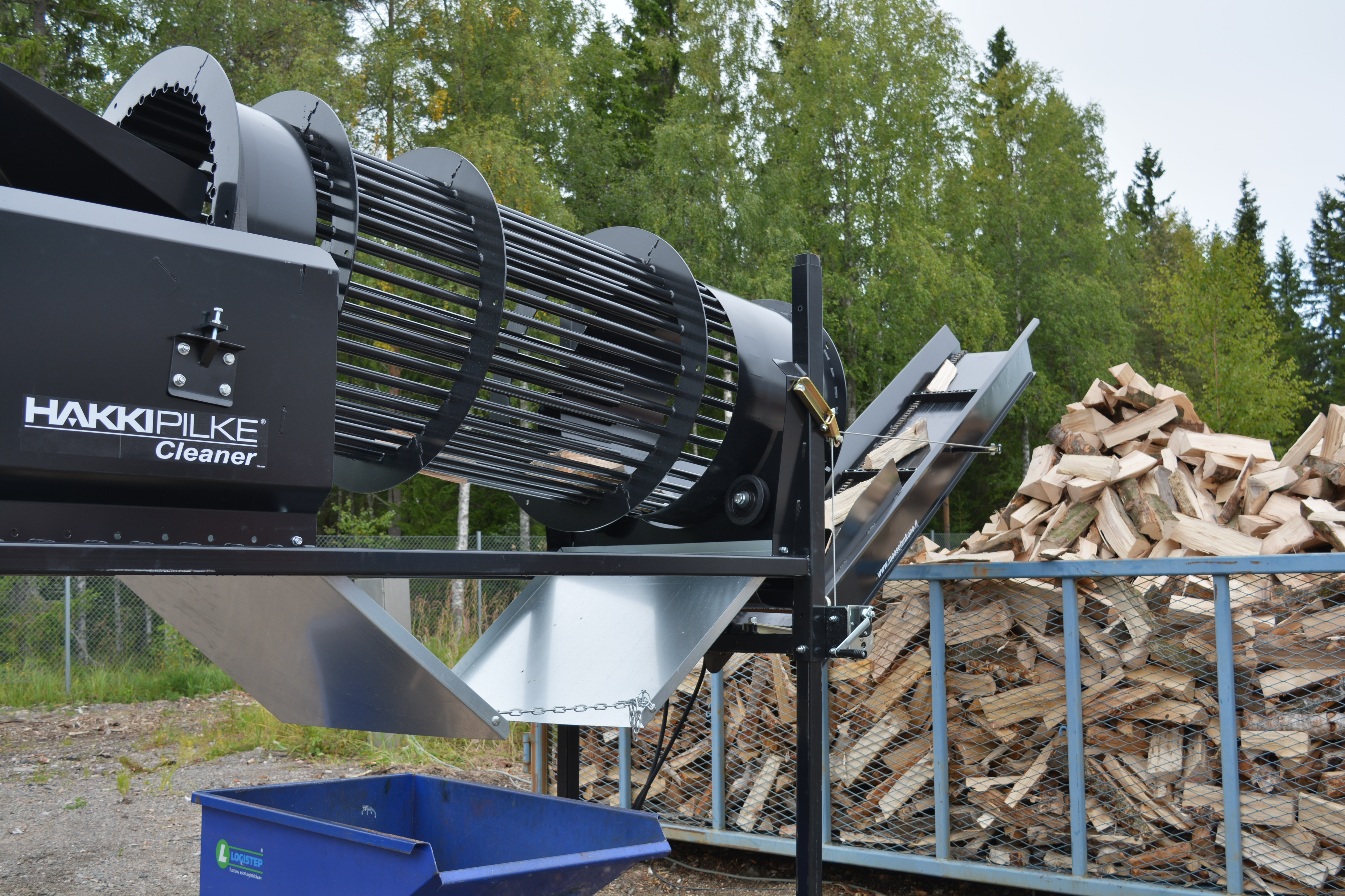 The Cleaners drum rotates while the firewood processor’s output conveyor feeds firewood into the cleaner. From the Cleaner, the firewood can be conveyed into sacks, for example, using the guide plate. The pivoting extension conveyor (3 m), which is available as an accessory, can be used to convey the firewood onto a trolley, for example. Cleaning the firewood with the Hakki Pilke Cleaner expedites the drying process and ensures consistent quality. The Hakki Pilke Cleaner firewood tumbler is available with electric or hydraulic engine. Thanks to its adjustable height, the machine can be connected to almost all firewood processor models.